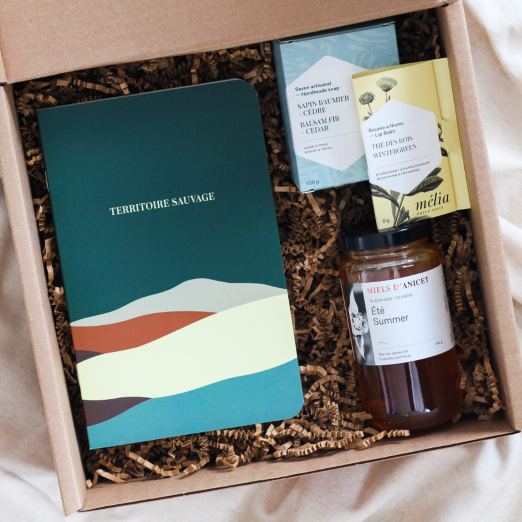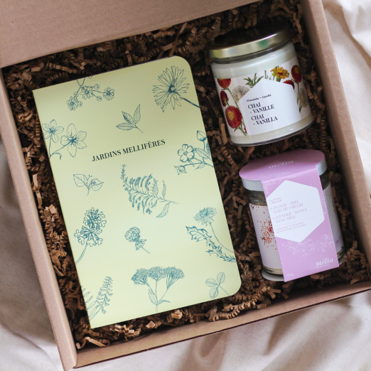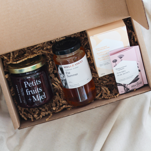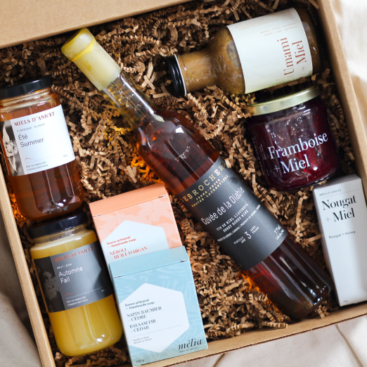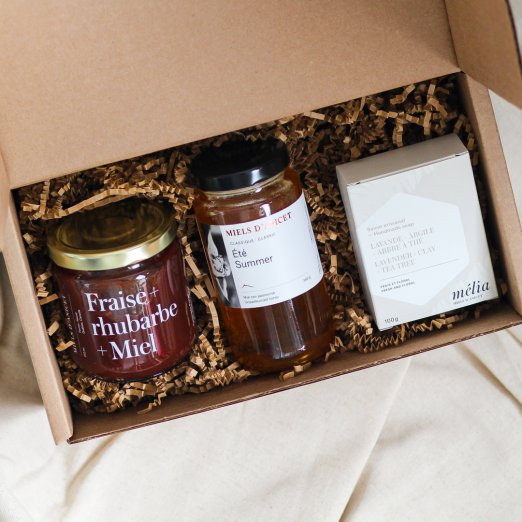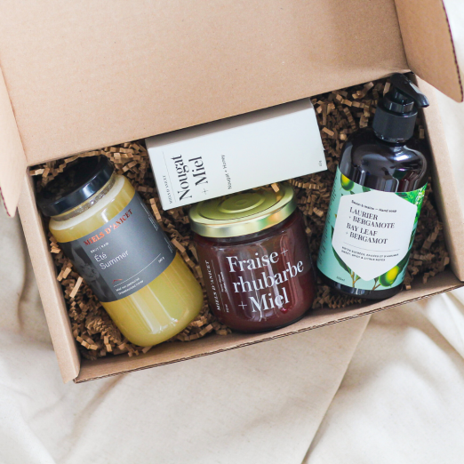 Nos nouvelles boîtes cadeaux sont minutieusement préparées au Rang 2 Gravel. Une belle idée d’assortiments de produits locaux qui reflètent notre territoire, de belle valeurs entrepreneuriales et qui bourdonnent des bienfaits !